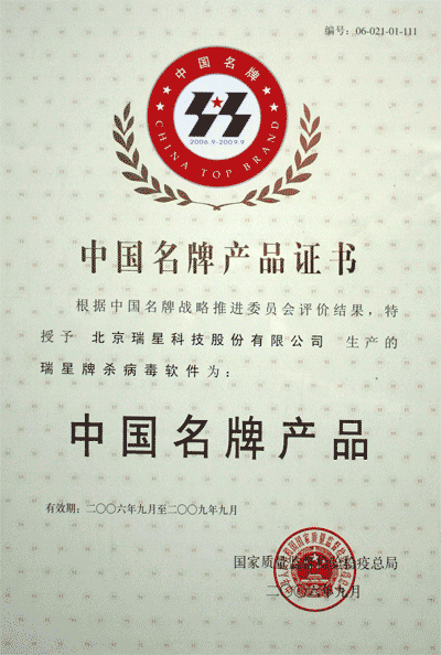 9月6日,中國名牌產品表彰大會在人民大會堂舉行,國家質檢總局、中宣部、國家發改委、共青團中央、全國總工會及國務院有關部門的領導出席了表彰大會,并向獲獎企業代表頒發獎牌和證書。在本次大會上,高新技術產業成為令人矚目的焦點,首批“中國名牌”軟件誕生,其中瑞星殺毒軟件榮獲大會頒發的“01-111”號中國名牌產品證書。