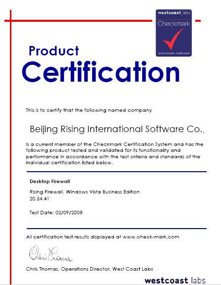 此前,瑞星防火墻順利通過了Windows? Vista平臺下的Checkmark認證,成為全球第三家、國內首家通過該認證的防火墻產品。