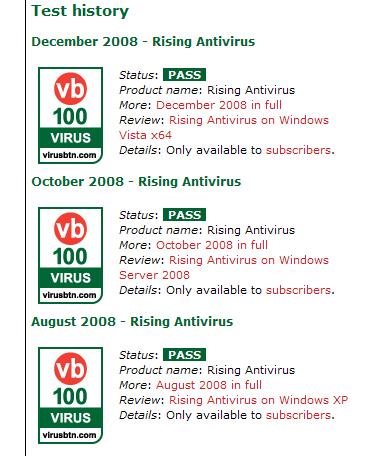 VB測試在每年的偶數月舉行,全年共評測6次。瑞星連續通過了2008年的8月、10月、12月三次VB測試,這充分說明了瑞星殺毒軟件在世界上的技術實力。通過了VB測評的產品,都將獲得一個VB 100%的認證標志。