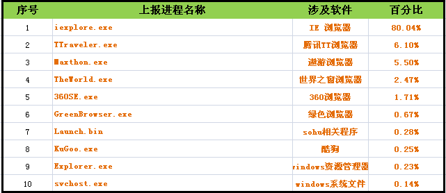 2009年上半年,瑞星“云安全”數(shù)據(jù)中心還記錄了訪問掛馬網(wǎng)站的進程,以及利用不安全進程訪問的掛馬網(wǎng)站數(shù)量。從下圖可以看出,使用瀏覽器訪問掛馬網(wǎng)站的數(shù)量最多,IE名列第一,騰訊TT和遨游緊隨其后。