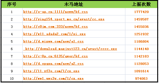 排行首位的木馬網(wǎng)站被攔截的次數(shù)70萬次;第二名的木馬網(wǎng)站被攔截次數(shù)為51萬余次;第十名的攔截次數(shù)也達到27萬余次。