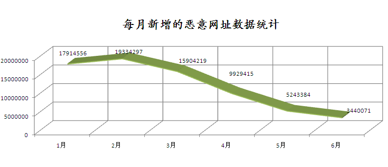 據(jù)瑞星“云安全”數(shù)據(jù)中心2009年上半年數(shù)據(jù)顯示,1月-6月新增的惡意網(wǎng)址數(shù)量為71765942個,平均每個月新增的惡意網(wǎng)址數(shù)量為11960990個,也就是說每天平均新增被掛馬url數(shù)量為398699個。