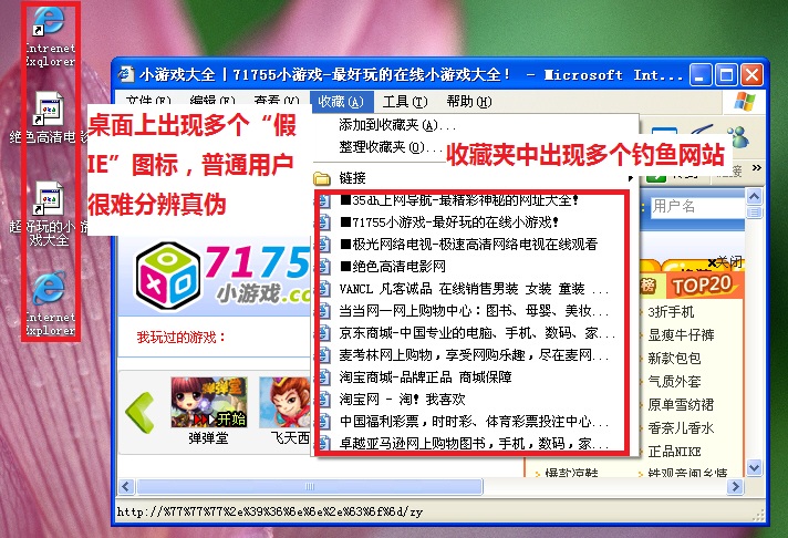 “世界杯木馬”運(yùn)行后,會(huì)在電腦桌面和IE收藏夾中生成十多個(gè)釣魚網(wǎng)站和惡意導(dǎo)航網(wǎng)站,還會(huì)在桌面上生成假IE圖標(biāo)迷惑用戶,并且無法直接刪除。用戶點(diǎn)擊后就會(huì)為這些網(wǎng)站帶來巨大流量,而且會(huì)因?yàn)樵L問釣魚網(wǎng)站致使用戶的個(gè)人隱私、銀行賬號等信息被盜。