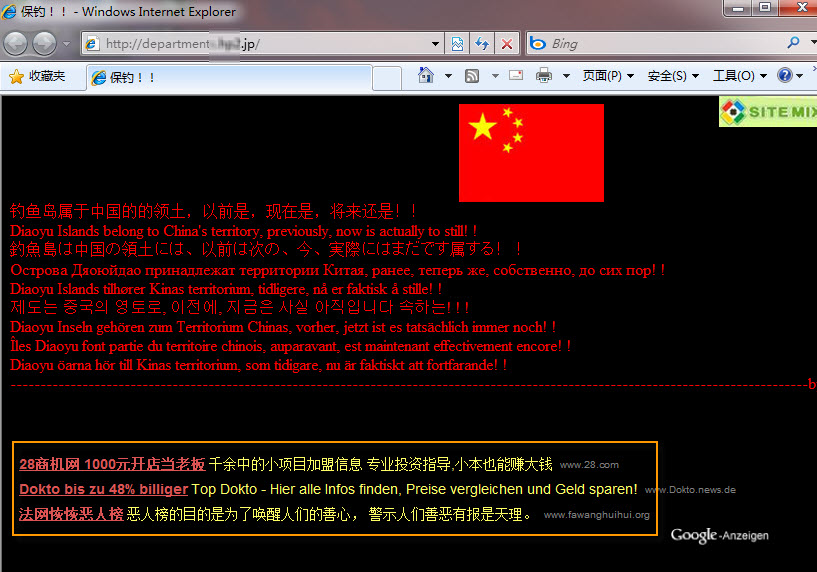 據介紹,近期以來隨著中日釣魚島爭端成為網民關注的焦點,有些不良黑客開始利用網民的心理來進行此類釣魚式詐騙。他們通常在日本網站申請免費的域名和空間,在上面建立一個簡單的攻陷頁面,就去各大論壇發貼,號稱自己攻陷了某某日本著名網站,其實是為了吸引網民去點擊頁面上的Google廣告,從而獲取收益。