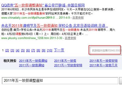 “公安廳發(fā)來的信息:如果你收到‘2011年五一放假調整通知’的網(wǎng)址。在任何環(huán)境下請不要打開它,且立即刪除它。如果你打開了它,你會失去個人電腦上的一切東西。”這就是通過微博、QQ進行轉發(fā)的謠言內容。更有甚者,竟然冒用“濟南市公安局濟南網(wǎng)監(jiān)辦的武警官”的身份發(fā)布謠言,造成大量網(wǎng)民上網(wǎng)搜索該信息的真?zhèn)危壳霸诎俣壬纤阉鳌?011年五一放假調整通知”關鍵字,已有近百萬的搜索結果,由此可見該謠言對網(wǎng)民造成的恐慌。