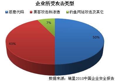 瑞星安全報告指出,高達90%的企業(yè)內(nèi)網(wǎng)(僅計算與互聯(lián)網(wǎng)連通的企業(yè)網(wǎng)絡)被成功侵入過至少一次。其中遇到惡意代碼(病毒和木馬等)侵入的比例占50%,黑客攻擊和滲透占43%,釣魚網(wǎng)站攻擊和其它形式安全事件占7%。