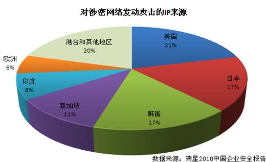 根據(jù)瑞星的估算,僅僅在2010年,針對這些涉密網(wǎng)絡的攻擊就高達10萬次以上,其中90%的攻擊IP地址來自國外,而美國、日本、韓國是排行最前的三個攻擊來源地。