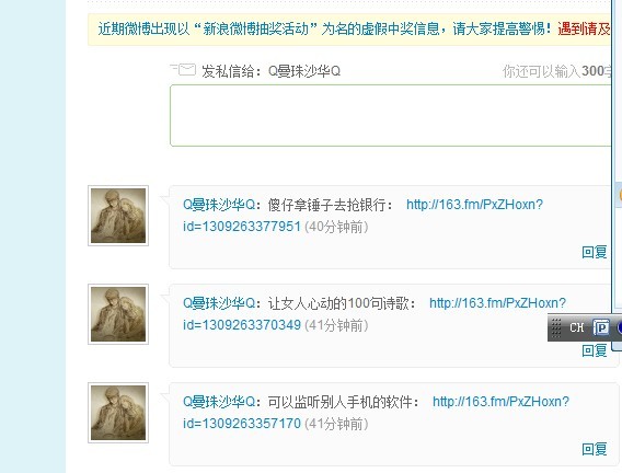 微博用戶中毒之后,會(huì)自動(dòng)發(fā)送一條誘惑性的含毒微博,比如:“3D肉蒲團(tuán)種子,http:#####”;加一個(gè)病毒作者設(shè)定的ID為關(guān)注對(duì)象;同時(shí)向自己所有的粉絲發(fā)送誘惑性私信,以此來進(jìn)一步傳播。