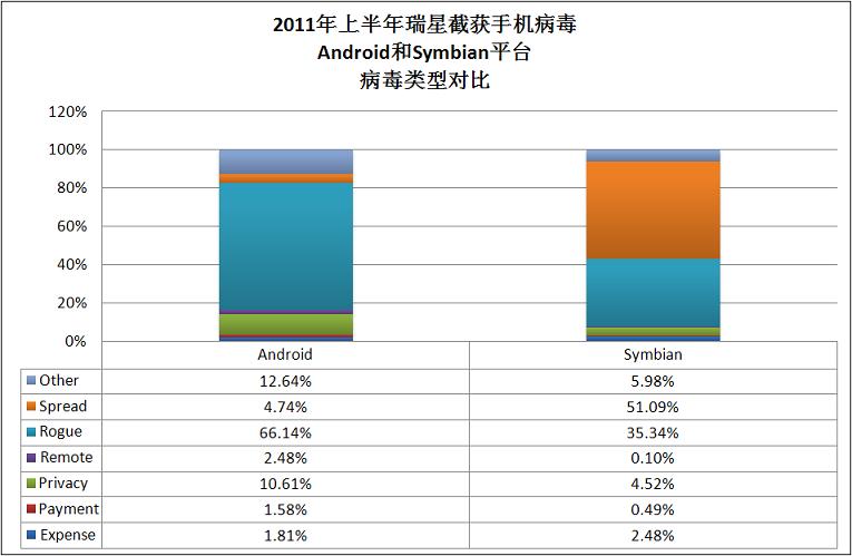 由上圖可以看出,安卓病毒的66.14%是流氓程序,主要通過與其它安卓應用捆綁來侵入用戶電腦;而竊取隱私的病毒占據了總體數量的10.61%。而塞班病毒則主要竊取用戶隱私和通過傳播、耗費電池來危害用戶手機。之所以產生此類不同,是因為安卓系統更加開放,應用在安卓系統上可以實現更多的功能,從而導致泄露隱私的機會增加。