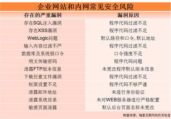 在瑞星檢測過的高等級涉密網絡中,常見的安全問題包括XSS漏洞、文件讀寫權限不規范、泄漏敏感信息、弱口令等。尤其是弱口令和泄漏敏感信息,在90%以上的企業局域網中廣泛存在。