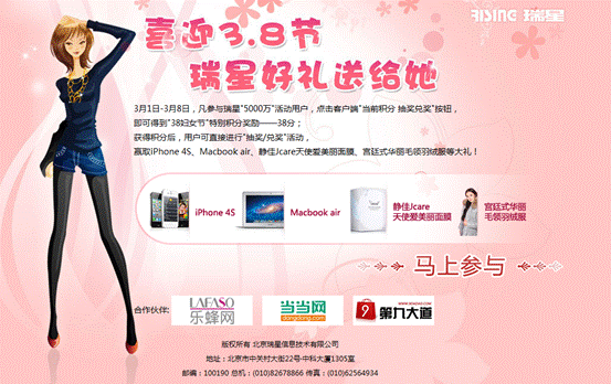 2012-03-01 13:02:24“瑞星5000萬豪禮活動將華麗轉身,升級版3月1日上線,喜迎3.8節送福利!”記者日前從瑞星公司獲悉,備受關注的“瑞星5000萬豪禮回饋新老用戶”活動又添新驚喜。3月1日至8日,凡參與活動的用戶,點擊客戶端“當前積分 抽獎兌獎”按鈕,即可得到“三八婦女節”特別積分獎勵——38分;獲得積分后,用戶可直接參加“抽獎/兌獎”,贏取iPhone 4S、Macbook air、第九大道華麗羽絨服、靜佳Jcare天使愛美麗面膜等超值優惠大禮!