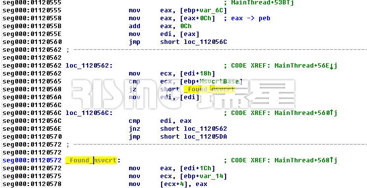 3)?加載msvcrt.dll,取得當前進程的PEB,通過基地址從LDR鏈表中找到msvcrt.dll所在的鏈表入口,修改掉該鏈表中標記的DLL入口地址指向病毒代碼,病毒線程退出后,Hook DLL入口的代碼會獲得執(zhí)行權,實現(xiàn)病毒DLL的卸載。