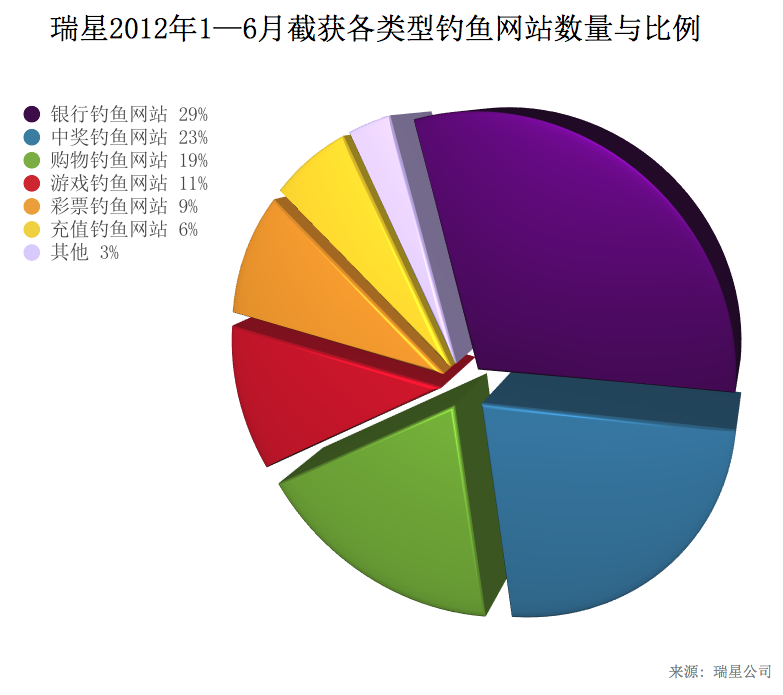 2012年1至6月,瑞星截獲釣魚網(wǎng)站315萬個(以URL計算),是去年同期的1.3倍;共 9,903萬人次網(wǎng)民遭釣魚網(wǎng)站侵襲。具體分布情況如下: