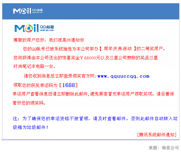 一位李小姐就表示曾經(jīng)收到過QQ中獎的郵件。網(wǎng)頁中有QQ的LOGO以及詳細的兌獎步驟,按照提示填寫了個人資料以后,該網(wǎng)站就要求李小姐填寫自己的銀行賬號及密碼。這使李小姐警惕起來,仔細一看,網(wǎng)頁顯示的地址并不是騰訊公司的官方頁面,而是www.qquuccqq.com。