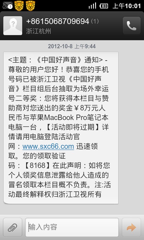 據(jù)瑞星安全專家介紹,這些以《中國好聲音》為名的欺詐,在細(xì)節(jié)上可謂是下足功夫。眾所周知,《中國好聲音》是浙江衛(wèi)視的知名節(jié)目,所以不法分子刻意選擇了浙江杭州的手機(jī)號(hào)來向用戶發(fā)送欺詐短信。然而,正是這個(gè)細(xì)節(jié)使騙子暴露無疑,因?yàn)楝F(xiàn)在正規(guī)客服短信一般都使用1065、1069等開頭的12位或者14位號(hào)碼,而用普通手機(jī)號(hào)發(fā)送的大部分此類信息基本上都是欺詐短信。