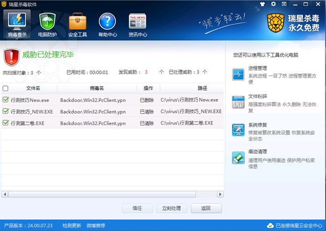 圖2:瑞星殺毒軟件v16查殺偽裝國考資料的病毒