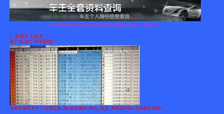 近期,一個非法售賣汽車車主信息的網站悄然出現。該網站聲稱“可查全國車主個人身份信息”,并可詳細獲知車主的“居住地址、姓名、電話、身份證號碼、發動機號碼”。在該網站上,有關車主的個人資料明碼標價僅售130元一套。除此之外,該網站還有駕駛執照出售,每月限購兩個。
