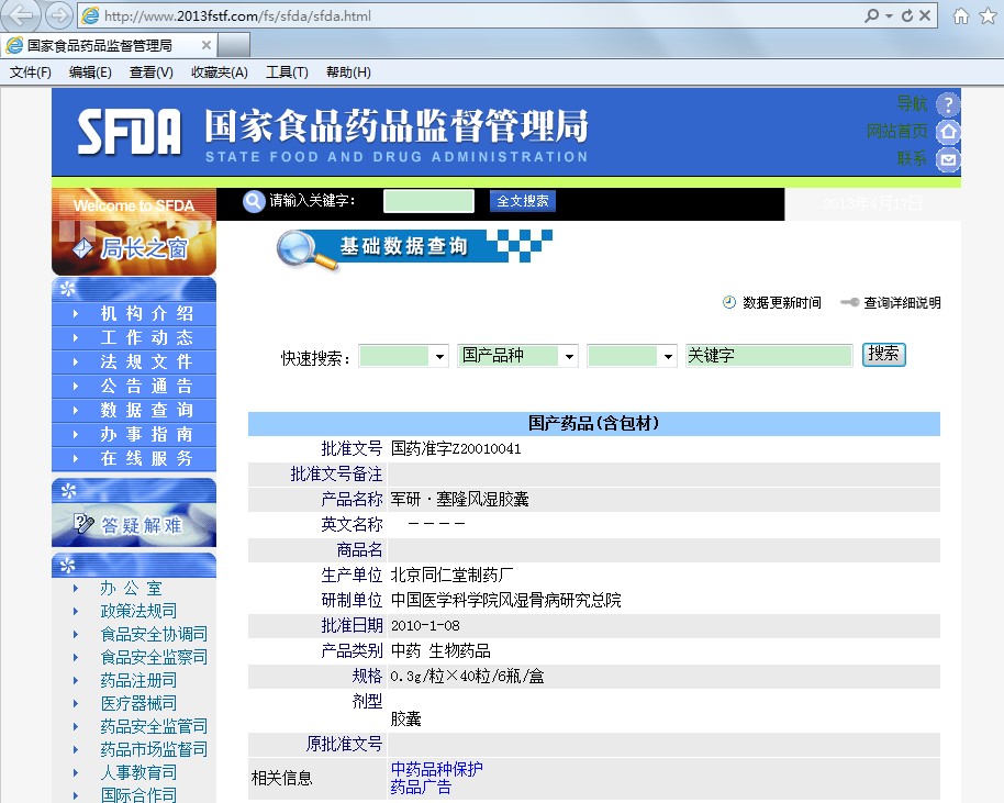 當網友在查看藥品介紹時,會看到藥監局防偽的批準文號,點擊查看后會直接彈出“藥監局”的數據查詢頁面,里面藥品的批準文號、生產廠商、藥品規格及批準日期等介紹一應俱全,使人誤以為這就是藥監局的官網。但據瑞星安全專家介紹,真正的國家食品藥品監督管理總局英文縮寫應是CFDA,而該頁面雖自稱為“國家食品藥品監督管理局”,但英文縮寫卻為SFDA,雖然只是一字之差,但內容卻大相徑庭。并且,該“藥監局”網址并非政府機構專用的“.gov” 域名,而是掛靠在“風濕骨病研究院”的主域名下,由此可見,該頁面是山寨貨無疑。