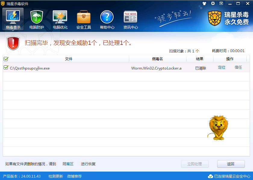 圖注:瑞星殺毒軟件已可徹底查殺“密鎖”病毒