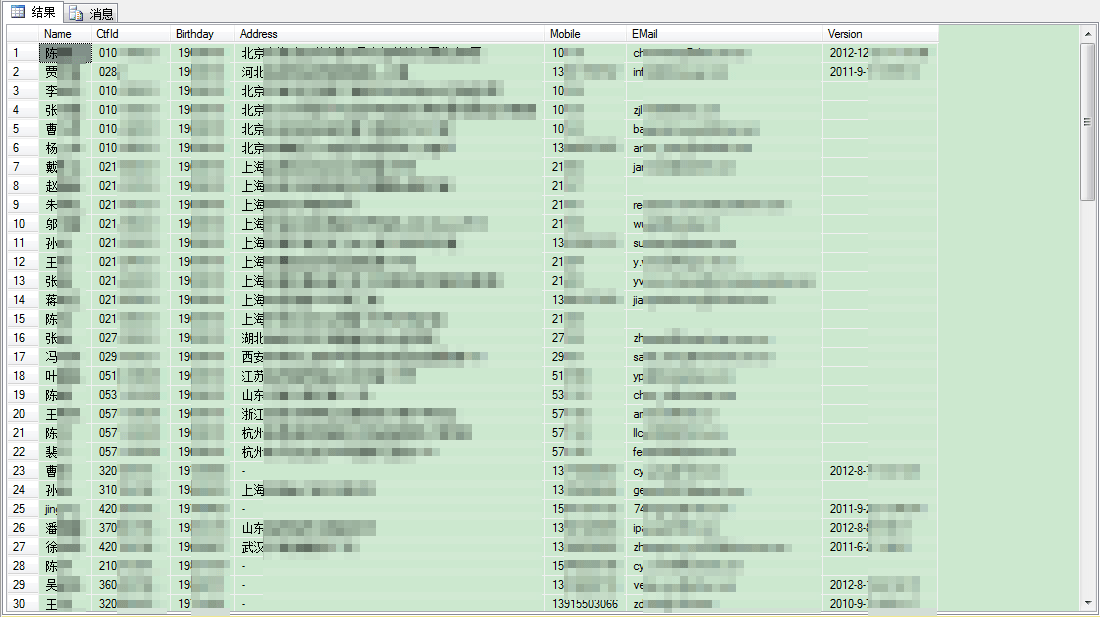 通過Webshell中的文件查看功能,我們找到了數(shù)據(jù)庫連接信息,并在該信息基礎(chǔ)上獲取了目標(biāo)數(shù)據(jù)庫中黑客比較感興趣的數(shù)據(jù)庫表及用戶的敏感數(shù)據(jù)信息,如下圖所示。