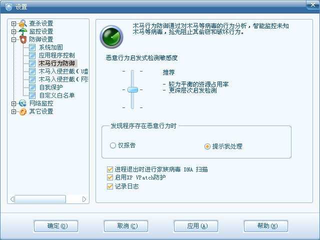 在彈出的設置程序界面中,切換到“木馬行為防御”設置頁面,可以看到“啟用 XP VPatch防護”功能設置項,如圖