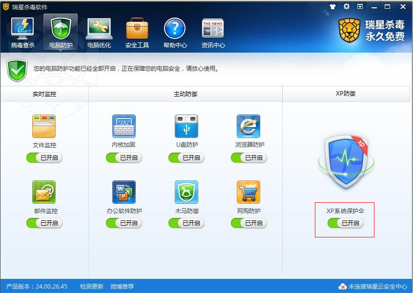 6.使用功能全面的專業安全軟件,開啟瑞星殺毒軟件的XP系統保護傘功能。