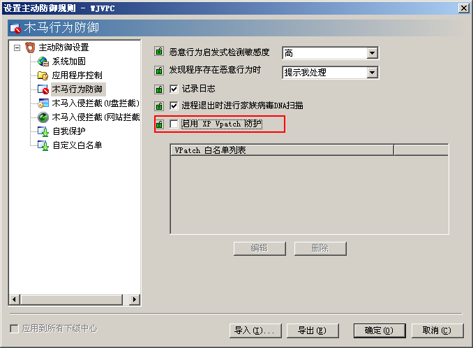 在“設置主動防御規則”界面,切換到“木馬行為防御”設置界面,可以看到“啟用 XP VPatch防護”功能設置項,如圖