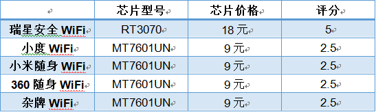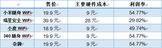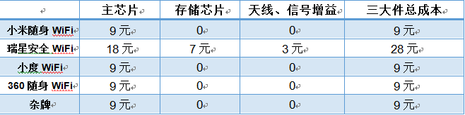 通過對隨身WiFi的這些主要硬件成本進行對比發現,用料最足的是瑞星安全WiFi,成本最高,為28元;小米、小度、360和雜牌的成本基本一致為9元。從核心硬件上可以直觀看出,瑞星的用料品質要遠遠超出其他幾家產品。