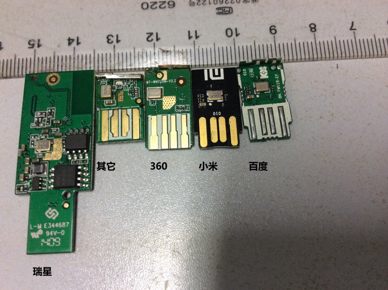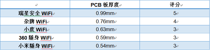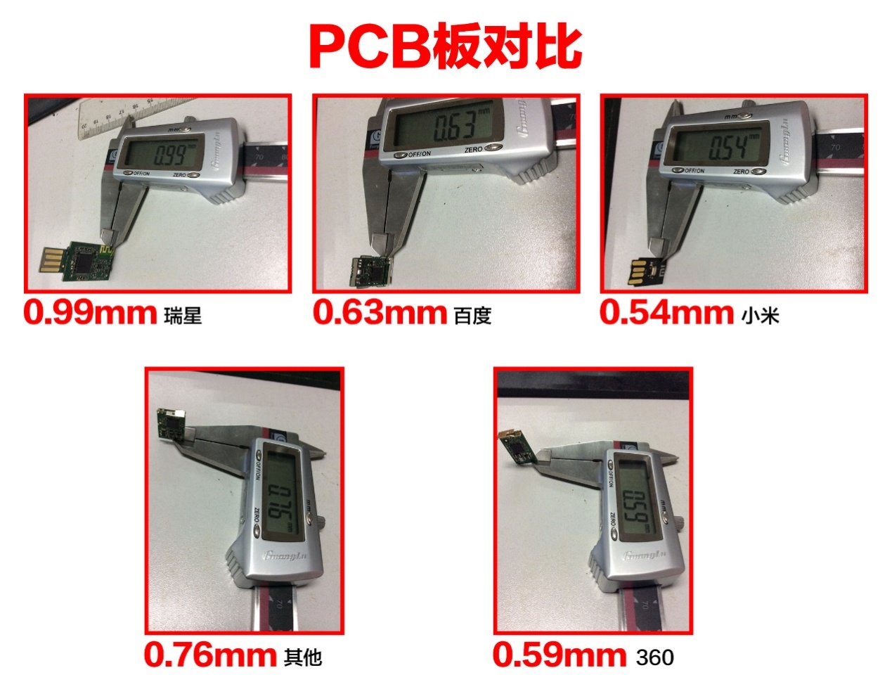 打個比方來說,PCB版的厚度就好像汽車外殼的鋼板厚度,厚度越大說明越結實,安全性更好。在五款隨身WiFi中,瑞星用料最為講究,所用PCB板最厚,雜牌WiFi排名第二,小米、百度、360成績墊底。