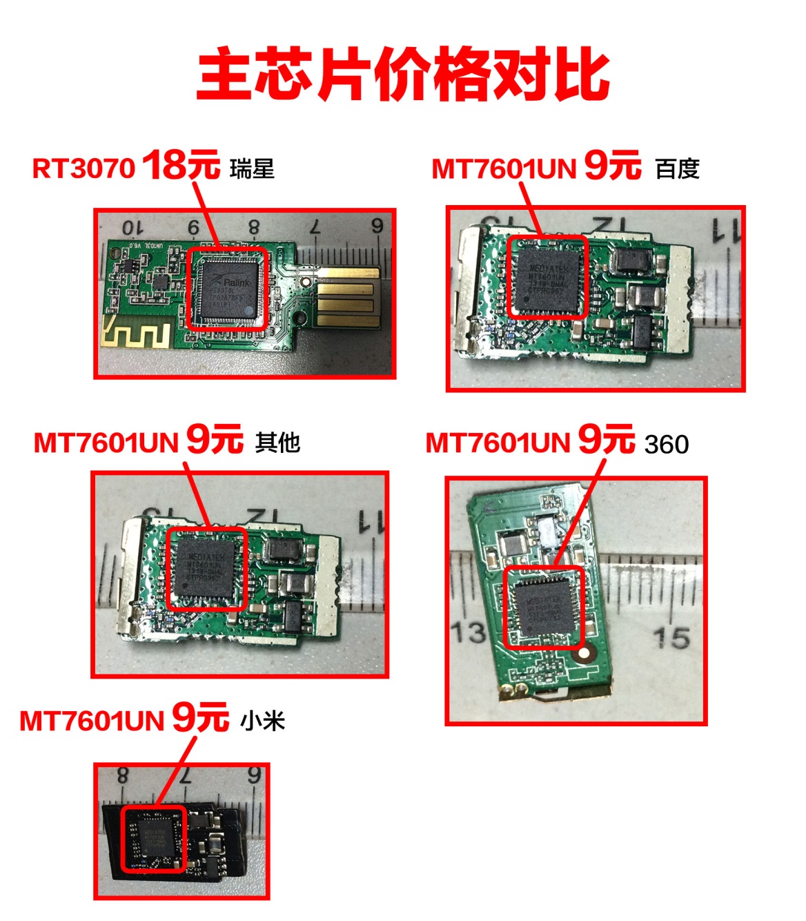 主芯片的好壞決定了隨身WiFi的好壞,好的芯片性能更穩定、信號更強、可擴展性更好。根據下表中芯片的標識可以看出,小米、百度、360及某雜牌WiFi的芯片全部采用了低功率的MT7601UN芯片,而瑞星則是采用了高功率的RT3070芯片。高功率的RT3070芯片可以提供更穩定的產品性能,并可以外接信號增益和驅動存儲芯片,而低功率的MT7601UN則無法帶動外接芯片。在價格方面,RT3070比MT7601UN貴了整整一倍。