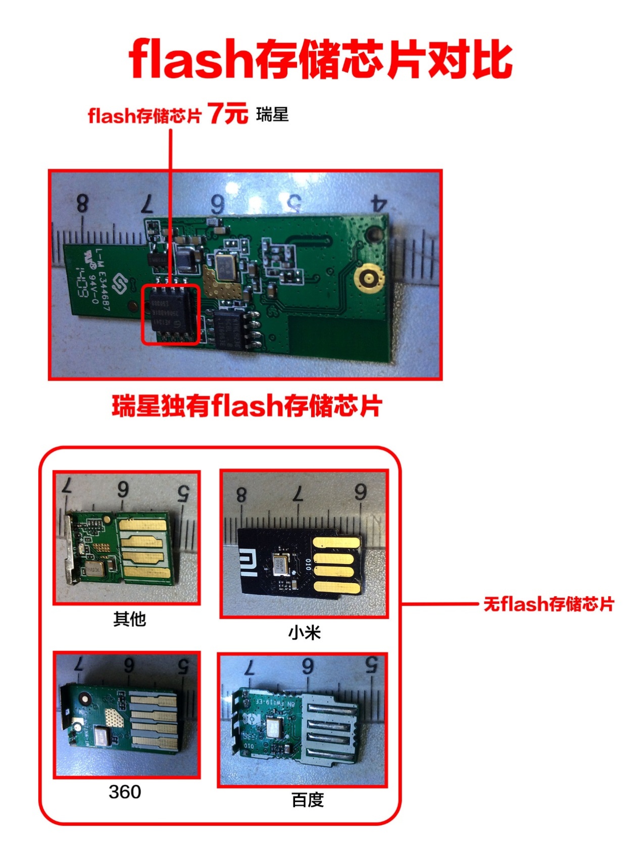 在上圖中可以明顯看到,五款產品比較,瑞星比其余四款的不同之處在于額外增加了一顆MX25L6406E flash存儲芯片,可以實現自帶驅動程序,無須用戶再上網下載,免去了電腦操作有限的用戶使用難度。該存儲芯片容量大小為8M,市場價約為7元。瑞星不同于其他家產品,在存儲芯片和使用簡易程度方面,占有絕對優勢。
