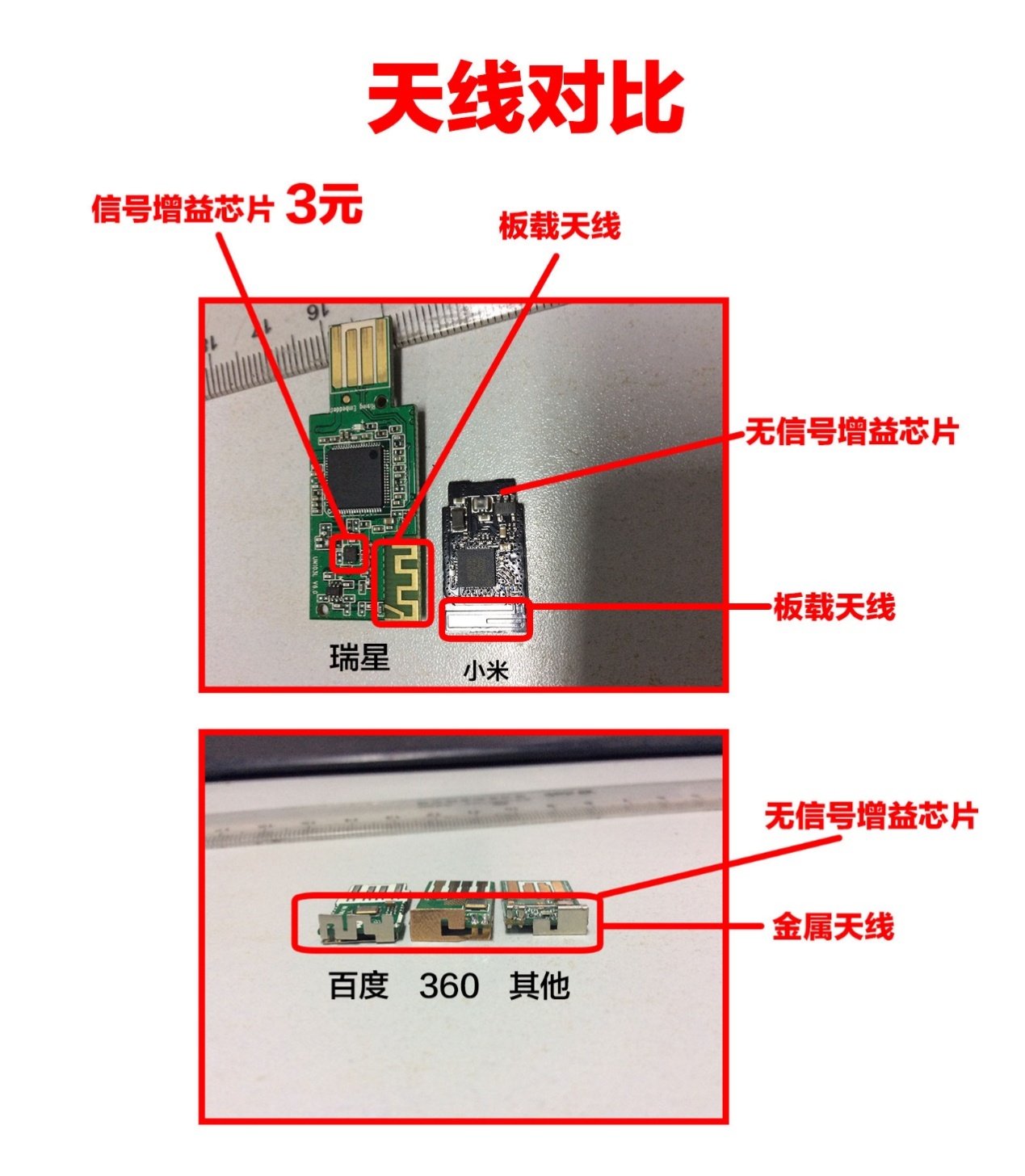 從圖6中可以看出,小米和瑞星使用了板載天線,而其他3家則使用了獨立的金屬天線。那么,是板載天線好還是金屬天線好呢?板載天線是嵌入在PCB板中的,其形狀不會因外力而改變,信號更為穩定。金屬天線掛接在PCB板后部,在產品封裝和運輸等環節中,容易出現變形等問題,進而導致信號不穩定。因此,小米和瑞星信號更穩定,優于百度、360及雜牌WiFi。
