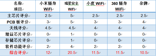 從最后的綜合評分來看,瑞星以20.5分的成績遠超其他四家。由此可以看出,瑞星安全WiFi在主流隨身WiFi中是性能及用料最佳的產品。如果打個比方來說,瑞星安全WiFi是隨身WiFi中的奔馳寶馬,而其他幾家產品更像是捷達普桑。但不得不說的是,小米、360和小度的外觀設計比較不錯,瑞星的則看上去有些符合技術型人士的感覺,在這里小編也給瑞星提個建議,要美化一下產品外觀設計。