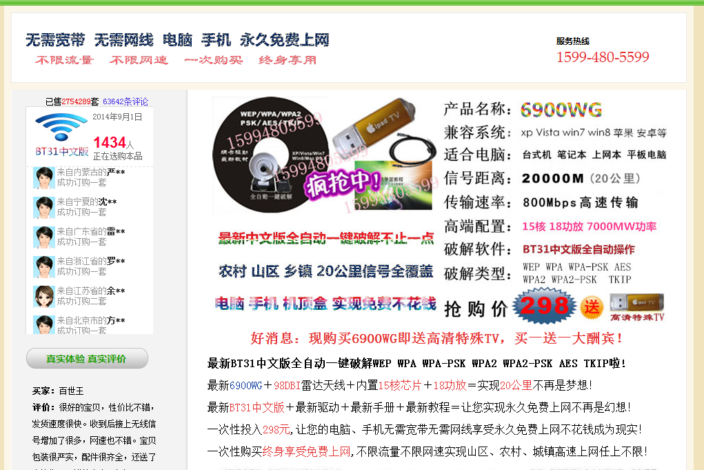 瑞星安全專家指出,蹭網本身就是盜取他人上網賬號及寬帶資源,屬于不正規行為。所謂硬件“蹭網神器”實際上就是一張高功率網卡,正常價格在100元左右,售賣“蹭網神器”的網站為其配上了一套從網上免費下載的黑客破解系統就開價298元,實屬欺詐。