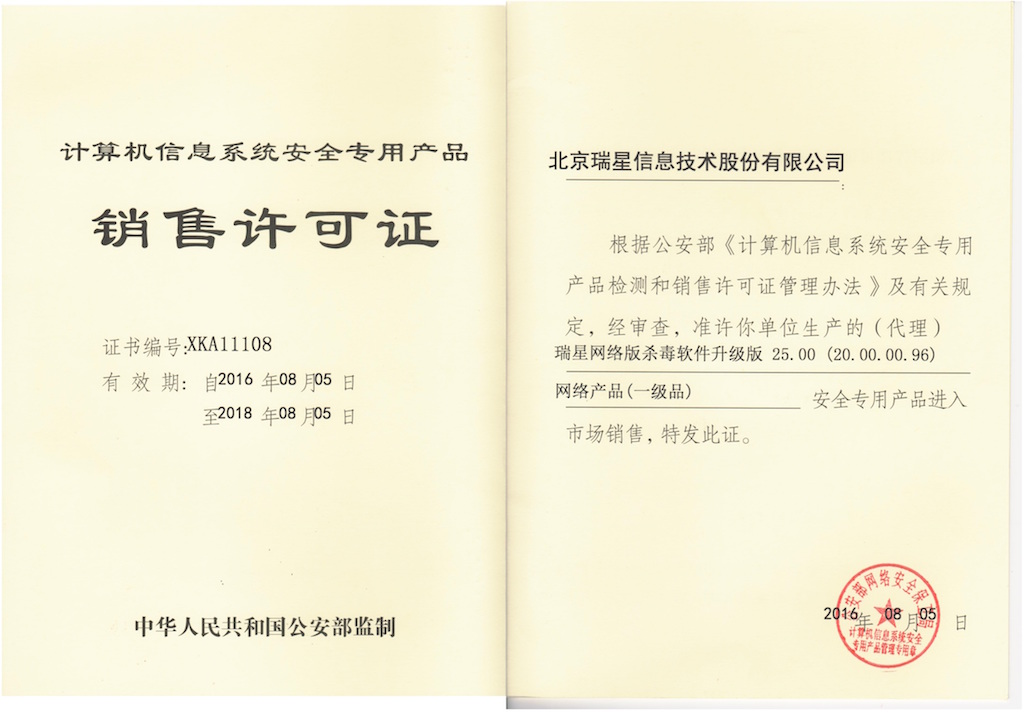瑞星殺軟網(wǎng)絡(luò)版升級(jí)版銷售許可證
